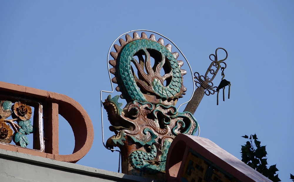 赫曦臺,在臺的左右內(nèi)壁上有丈余高的"福"、"壽"二字,臺的頂部雕飾有八卦圖、蝙蝠、壽字圖案。李仁奇 攝
