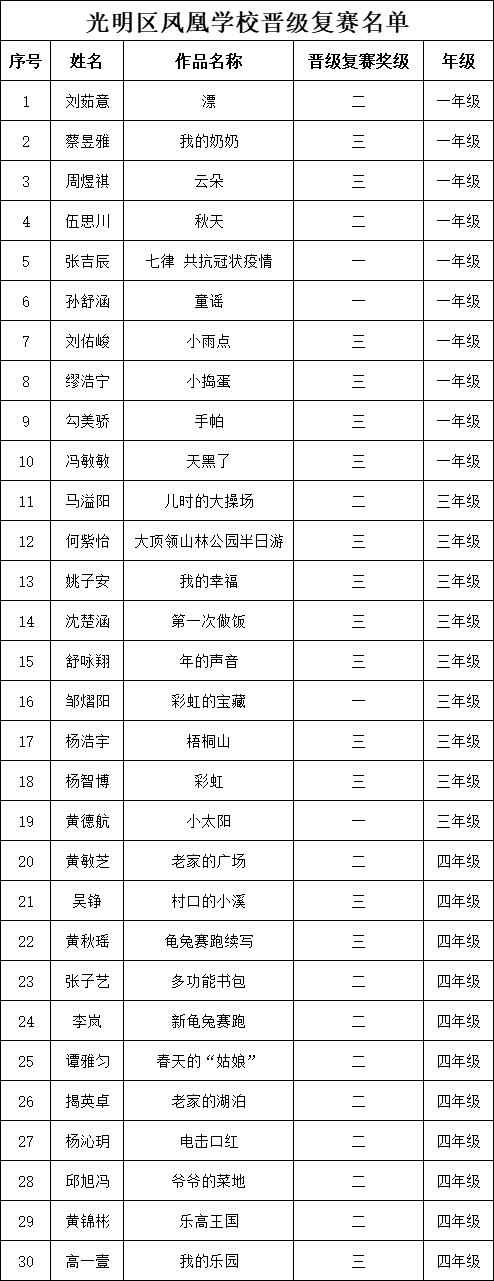 自2021年1月,活動征稿啟動以來,獲得了深圳市廣大中小學生、教師、文學愛好者的熱烈響應積極參與,吸引了深圳百余所學校的上萬人關注報名?,F(xiàn)公布深圳市光明區(qū)鳳凰學校專場晉級復賽名單如下: