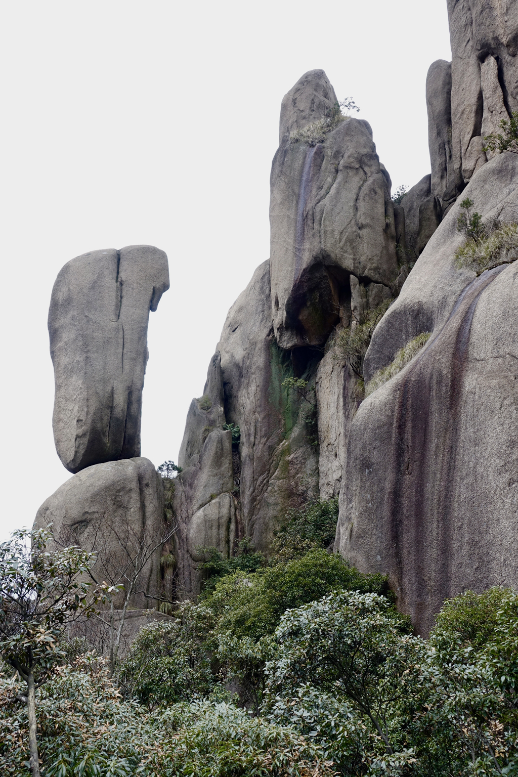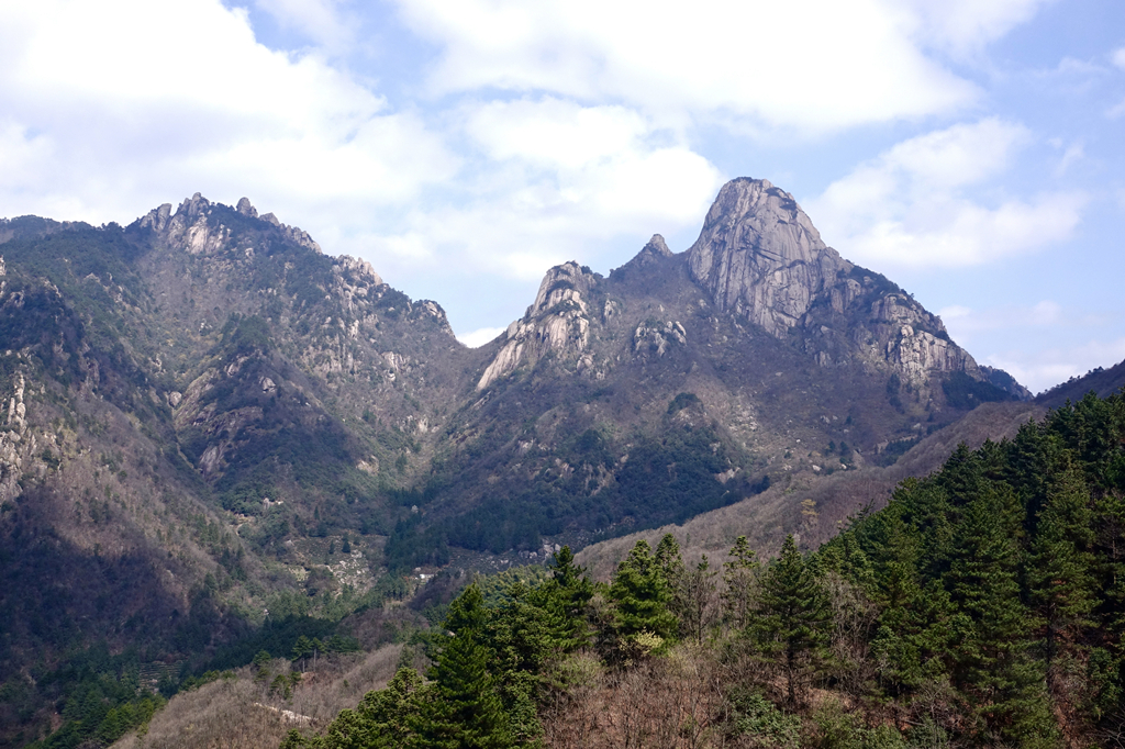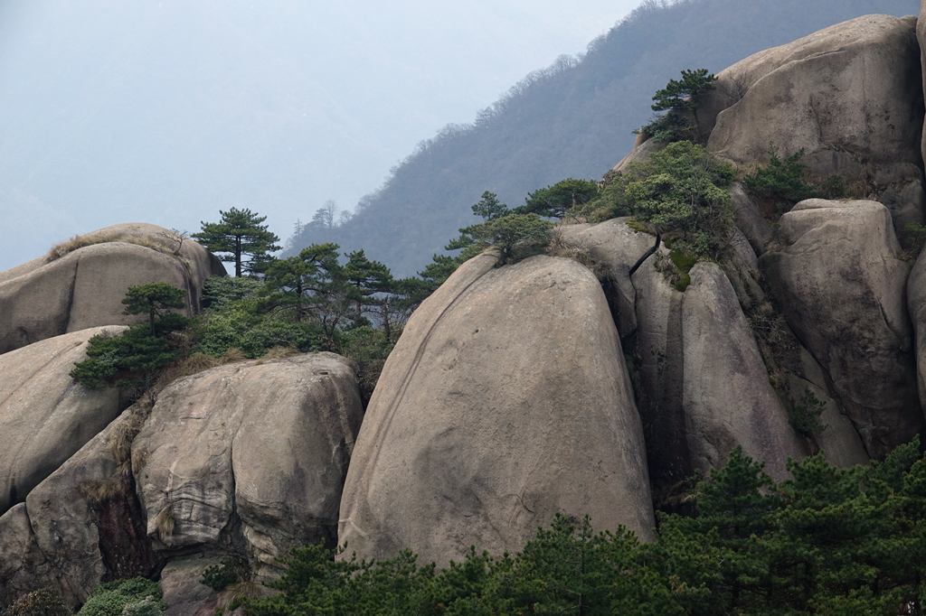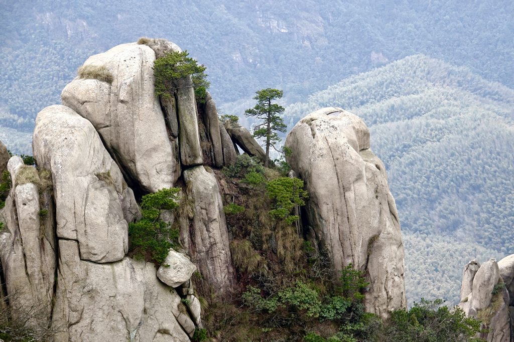 由于其隆起幅度自核心部位向周?chē)饾u減小,外圍山地由硬度較花崗巖小的花崗閃長(zhǎng)巖和沉積巖組成,易被沖刷蝕低,故整個(gè)九華山體由眾多千姿百態(tài)、高低參差的中山、低山、丘陵和山間盆地等組成。李仁奇 攝