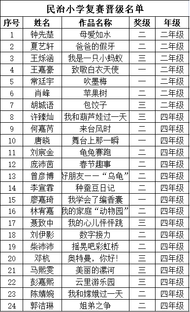 自2021年1月,活動(dòng)征稿啟動(dòng)以來,獲得了深圳市廣大中小學(xué)生、教師、文學(xué)愛好者的熱烈響應(yīng)積極參與,吸引了深圳百余所學(xué)校的上萬人關(guān)注報(bào)名?,F(xiàn)公布龍華區(qū)民治小學(xué)晉級(jí)復(fù)賽名單如下: