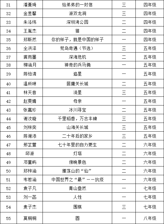 自2021年1月,活動征稿啟動以來,獲得了深圳市廣大中小學(xué)生、教師、文學(xué)愛好者的熱烈響應(yīng)積極參與,吸引了深圳百余所學(xué)校的上萬人關(guān)注報(bào)名。現(xiàn)公布南山中英文學(xué)校太子灣實(shí)驗(yàn)部晉級復(fù)賽名單如下: