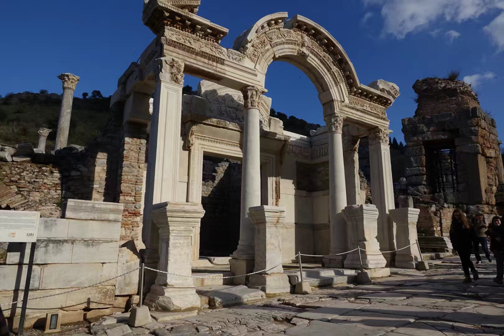 哈德良神廟就在圖書館斜對面,是典型柯林斯式神廟的代表,內墻廊柱上有不同神話人物的雕刻,拱門上有精美的浮雕,前側拱門上是幸運女神的頭像,內側拱門上是張開雙臂的蛇發(fā)女妖美杜莎的雕像。李仁奇 攝