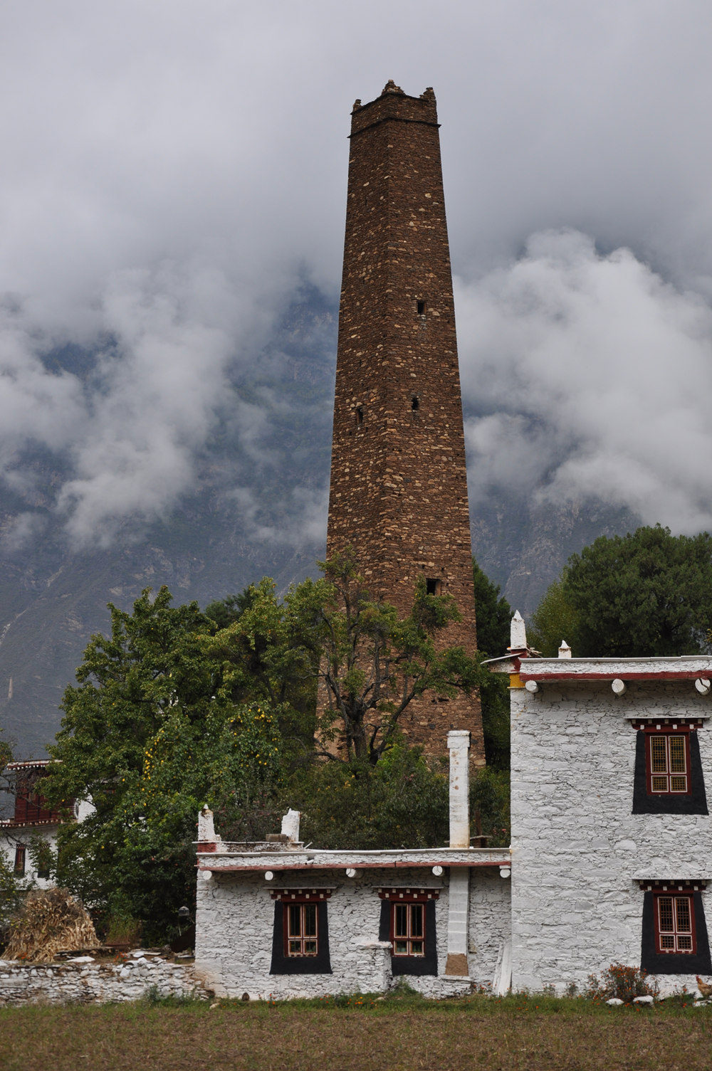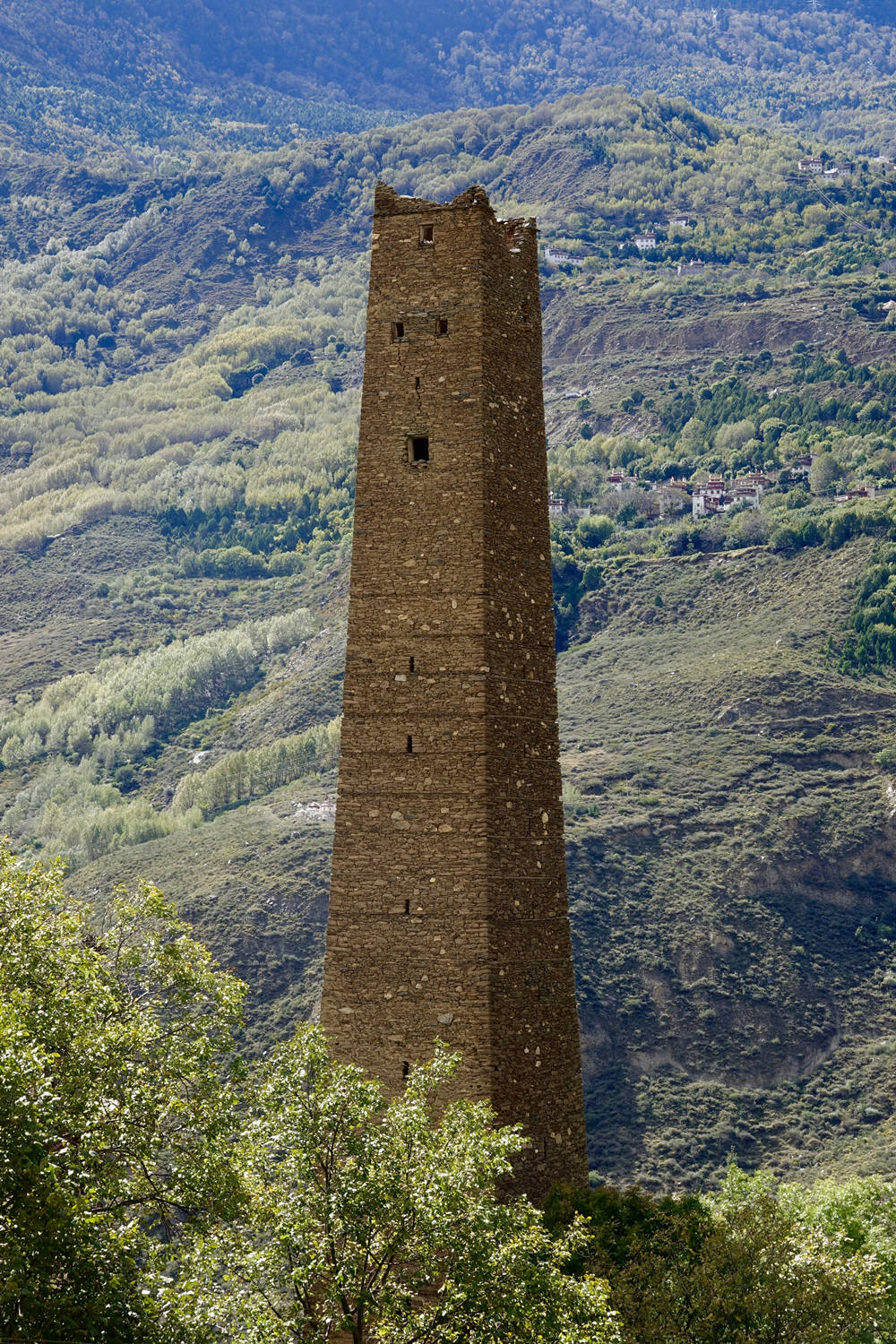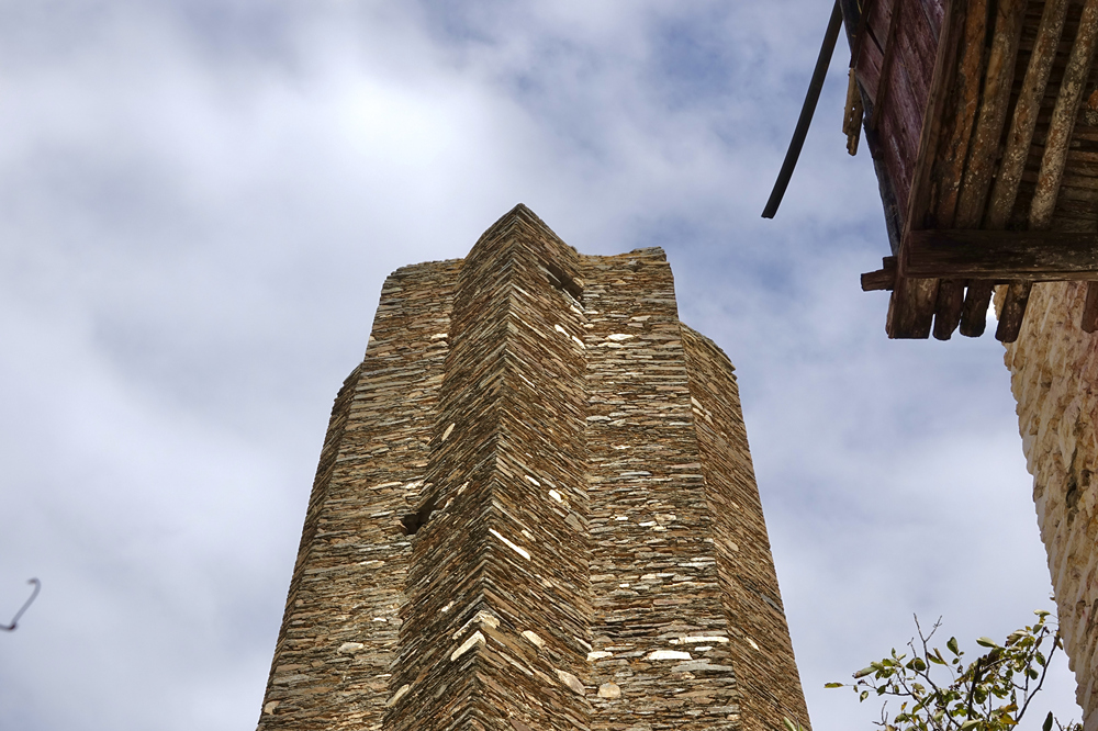 古碉為片石或石塊夾泥砌成,棱角筆直,墻面光滑,下寬上窄,一般高20余米,最高達50米,內(nèi)建樓層十余層至二十余層,每層可容納10余人。李仁奇 攝