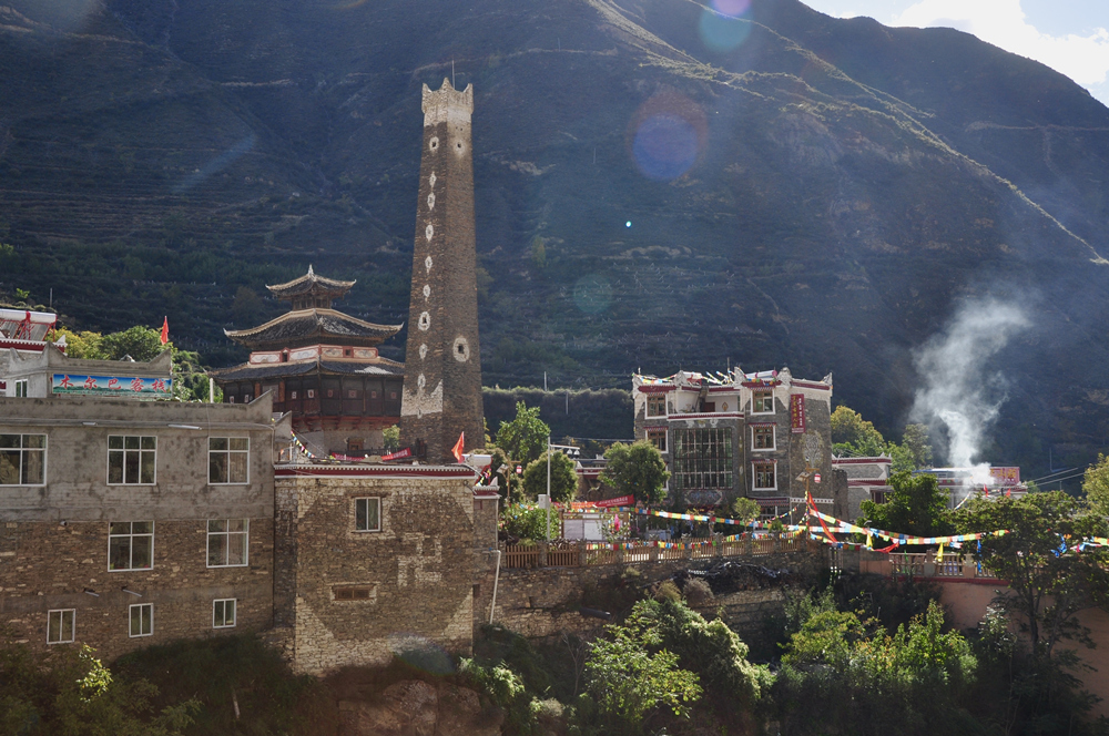 在它的后面三個碉樓特別吸引眼球。左邊第一座是五角碉,第二座是八角碉,第三座是常見的四角碉。李仁奇 攝