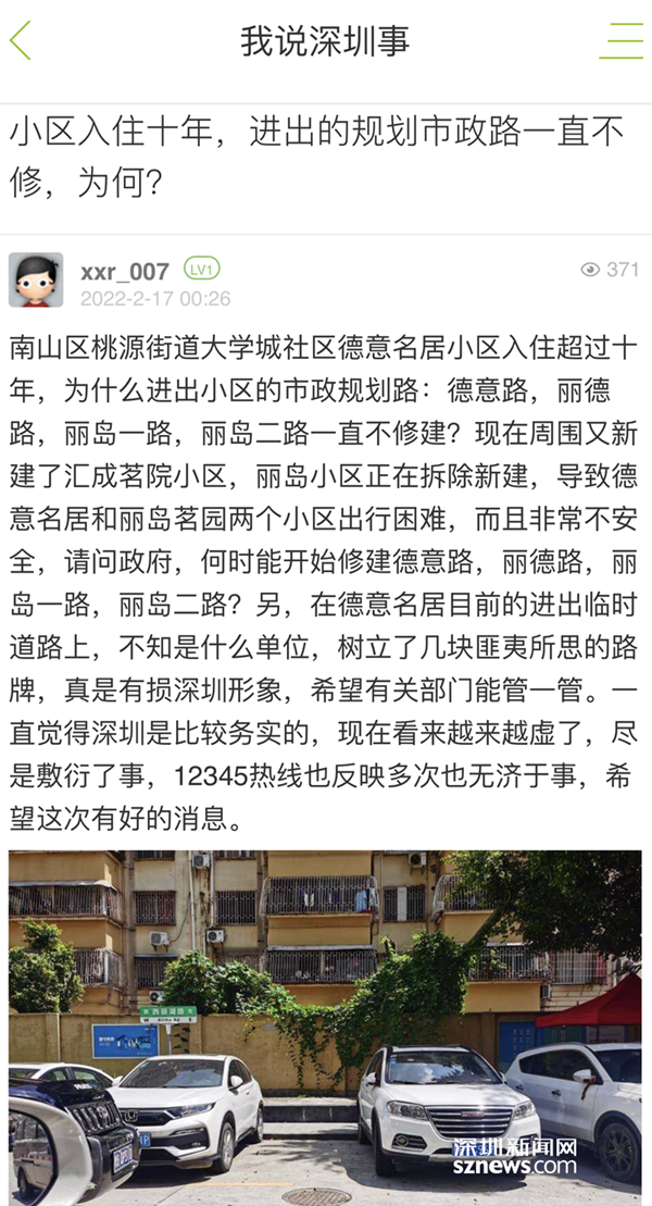 讀特客戶端·深圳新聞網(wǎng)2022年2月18日訊(記者 馮牧原 實習生 彭軼群)近日,有網(wǎng)友在深圳新聞網(wǎng)深圳論壇上報料稱,南山區(qū)桃源街道德意名居小區(qū)入住已超過10年,但進出小區(qū)的市政規(guī)劃路長期未修建,導致居住在附近小區(qū)的居民出行困難,車輛違停占用消防通道也存在安全隱患。