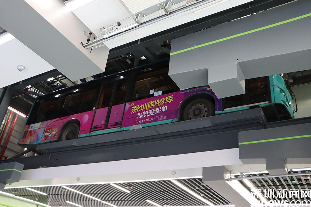 巴士正在倒入智慧公交車(chē)庫(kù)。