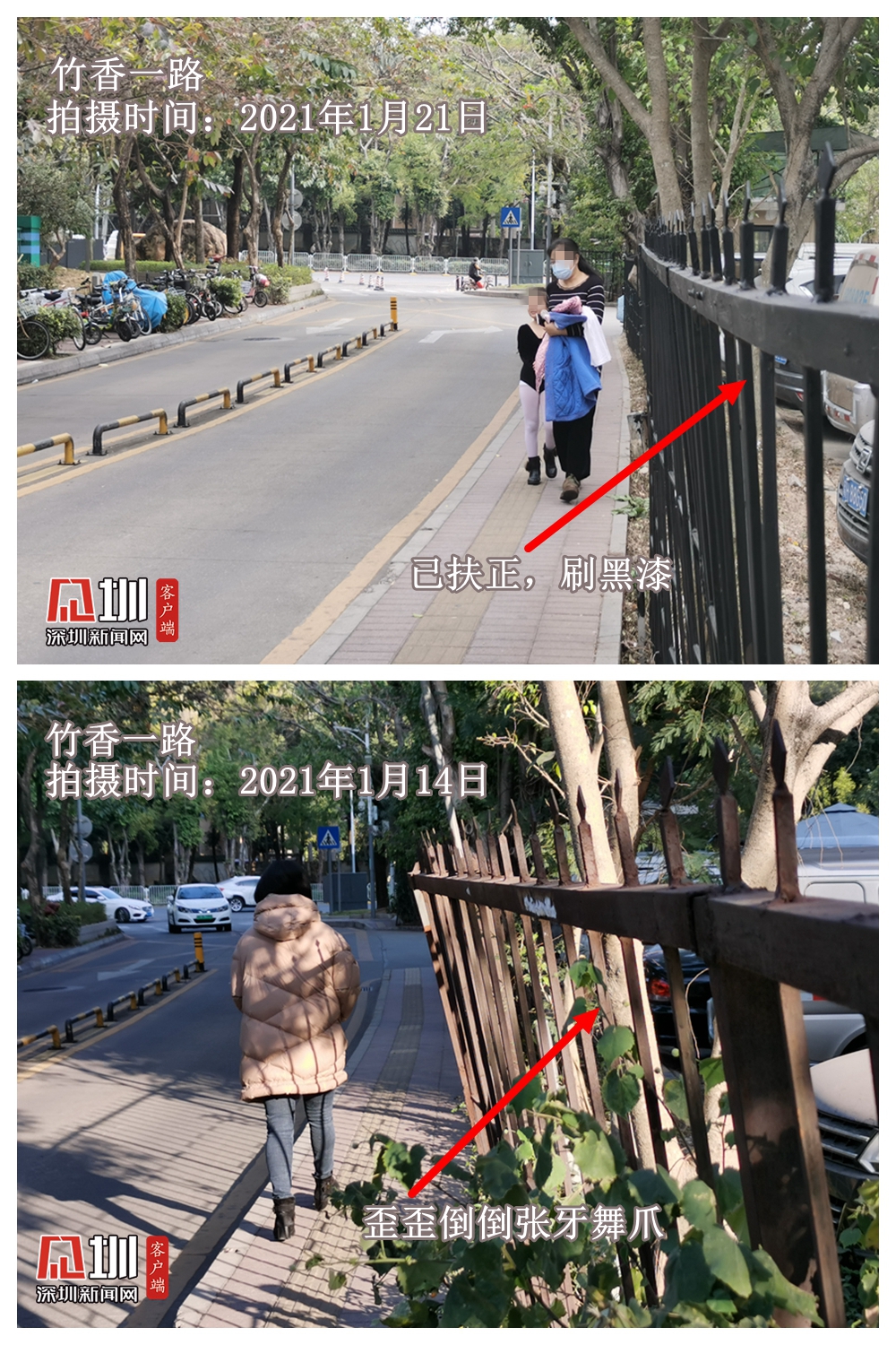 記者在竹香一路看到,原本向外傾斜的圍欄已經(jīng)全部扶正加固,且重新噴上黑色新漆,看起來整齊了許多,通行體驗較之前更好?!艾F(xiàn)在弄得不錯,比之前牢固很多,向外的尖尖也都弄整齊了”家住附近的王先生說。