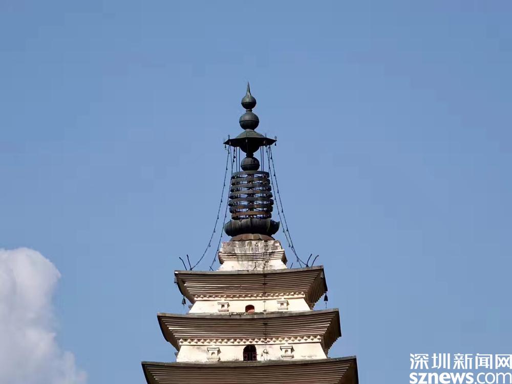 在千尋塔的塔頂四角,原來(lái)鑄有4只巨大的金翅鳥(niǎo),“金翅鳥(niǎo)”又名“大鵬金翅鳥(niǎo)”,為佛教護(hù)法神中的“天龍八部”之一,傳說(shuō)能鎮(zhèn)水患,后毀于地震。李仁奇 攝