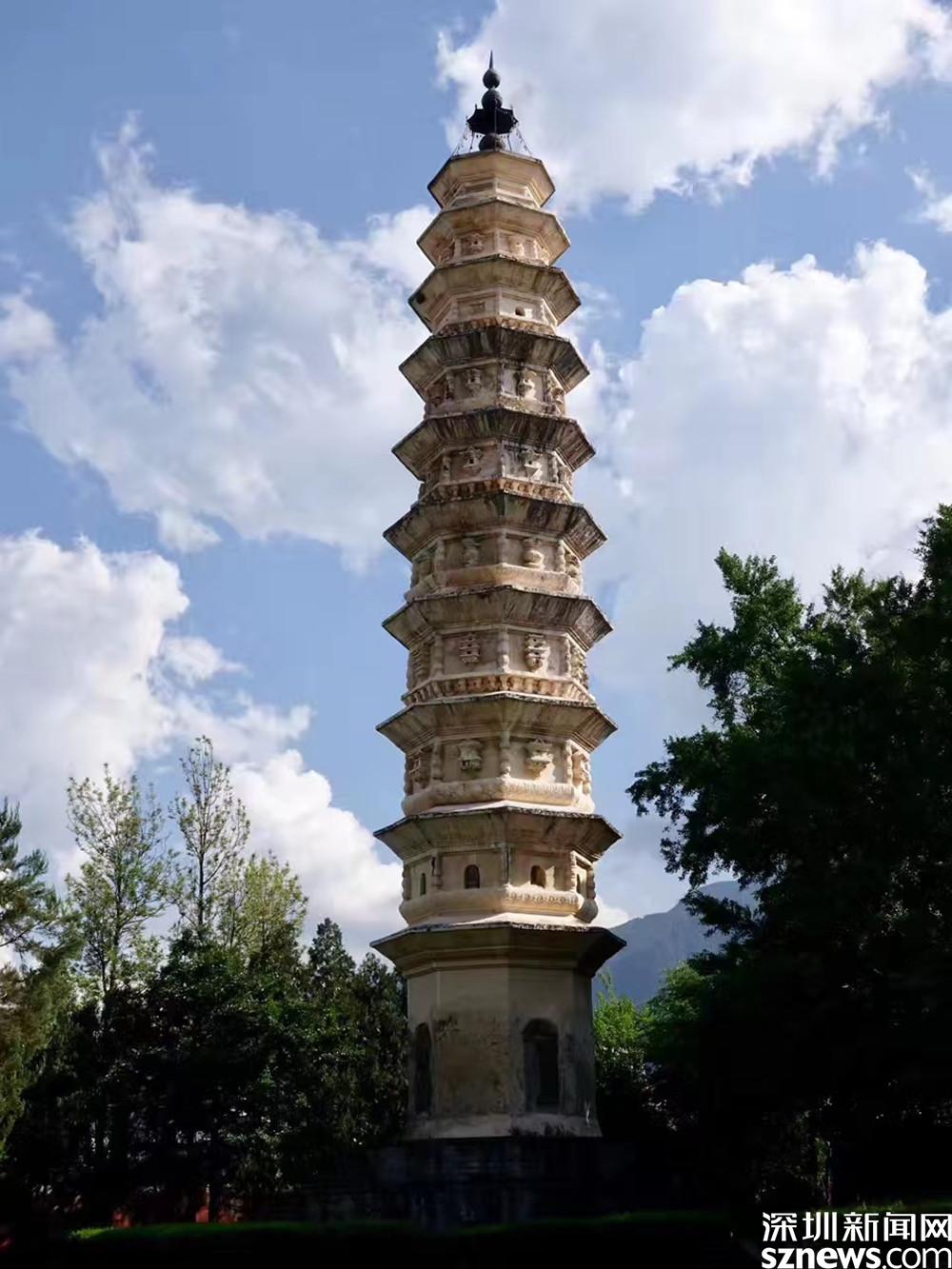 大塔名千尋塔,通高69.13米,底方9.9米,凡16級(jí)。南北小塔均為十級(jí),高42.17米,為八角形密檐式空心磚塔。李仁奇 攝