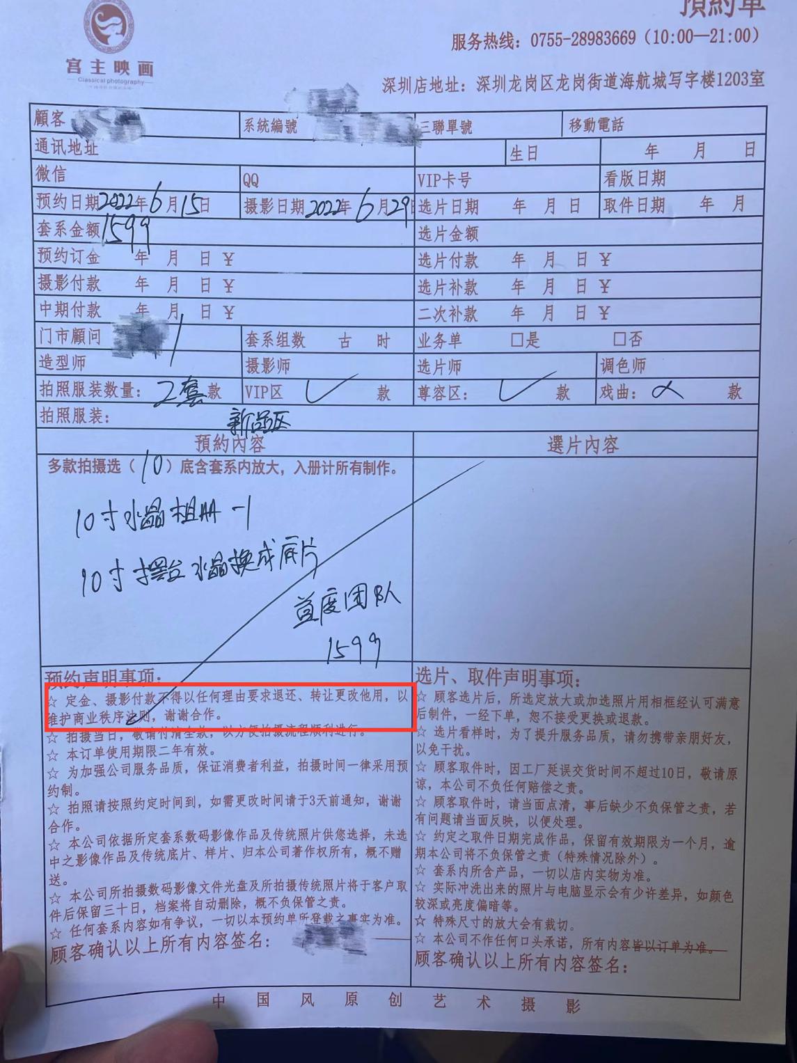 本人于2022年6月15日在該商家處支付了1599元購買寫真拍攝服務(wù),購買后因故離開深圳,無法繼續(xù)消費(fèi),故要求退還預(yù)付款。