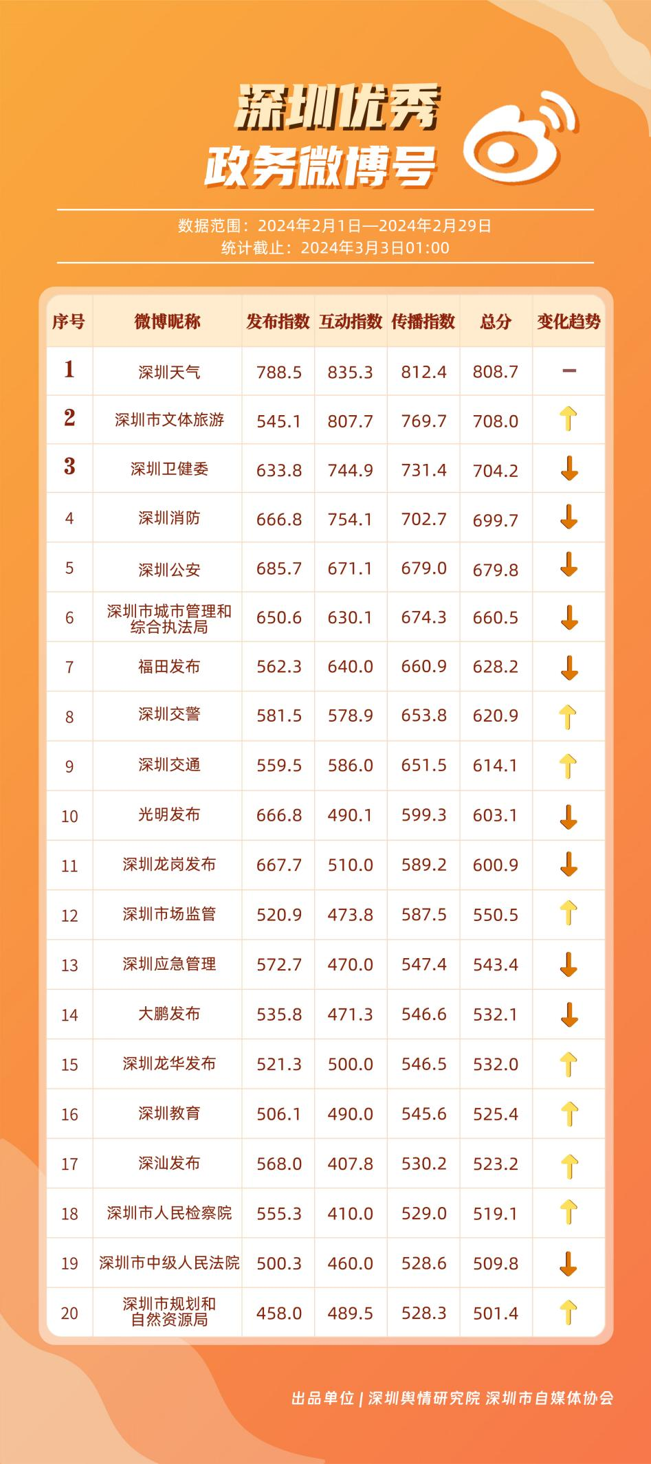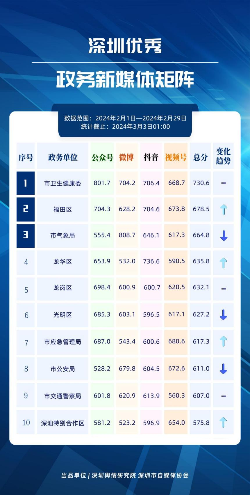 深圳新聞網(wǎng)3月21日訊(記者 陳曉君 實(shí)習(xí)生 蔡曉婷)3月19日,深圳輿情研究院、深圳市自媒體協(xié)會(huì)聯(lián)合發(fā)布《深圳優(yōu)秀政務(wù)新媒體矩陣》(2月期),市衛(wèi)生健康委、福田區(qū)、市氣象局、龍華區(qū)、龍崗區(qū)、光明區(qū)、市應(yīng)急管理局、市公安局、市交通警察局和深汕特別合作區(qū)新媒體矩陣榮獲“深圳優(yōu)秀政務(wù)新媒體矩陣”稱(chēng)號(hào)。這些新媒體矩陣主要結(jié)合市民實(shí)際需求進(jìn)行內(nèi)容創(chuàng)作與更新,推動(dòng)信息傳播質(zhì)效提升。