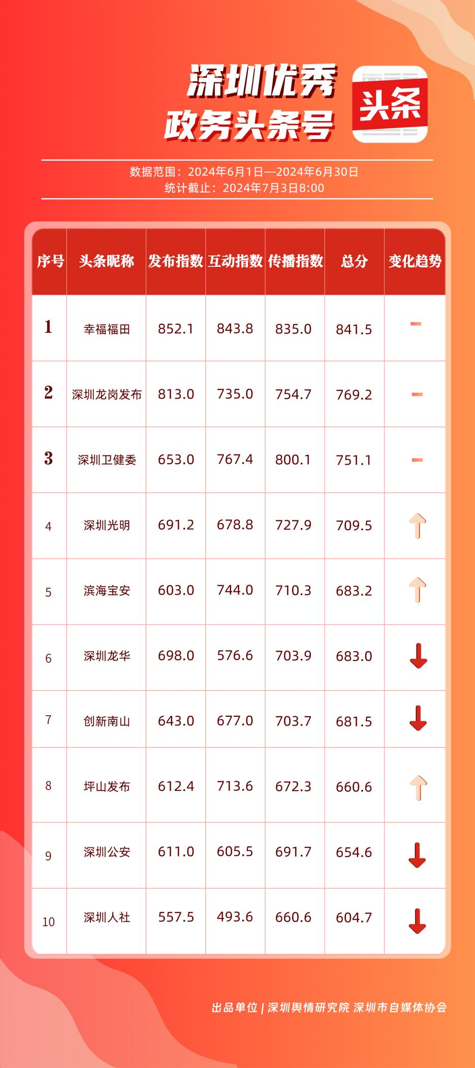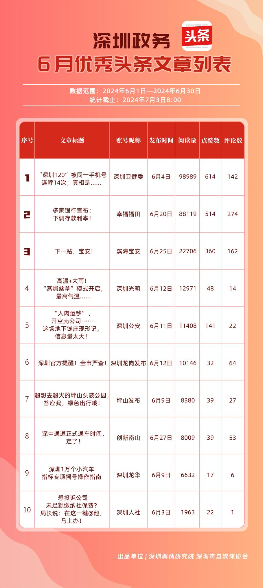 6月,“幸福福田”“深圳龍崗發(fā)布”“深圳衛(wèi)健委”“深圳光明”“濱海寶安”“深圳龍華”“創(chuàng)新南山”“坪山發(fā)布”“深圳公安”“深圳人社”共10個政務(wù)頭條號能夠及時發(fā)布政務(wù)信息及公共服務(wù)信息,入列“優(yōu)秀政務(wù)頭條號”榜單。從數(shù)據(jù)上分析,《“深圳120”被同一手機號連呼14次,真相是……》《多家銀行宣布:下調(diào)存款利率!》《下一站,寶安!》等優(yōu)秀文章為網(wǎng)民提供醫(yī)療急救、經(jīng)濟政策、區(qū)域發(fā)展等領(lǐng)域的信息,發(fā)揮各自賬號在信息傳播、公共服務(wù)等方面的重要功能,收獲較高點贊。