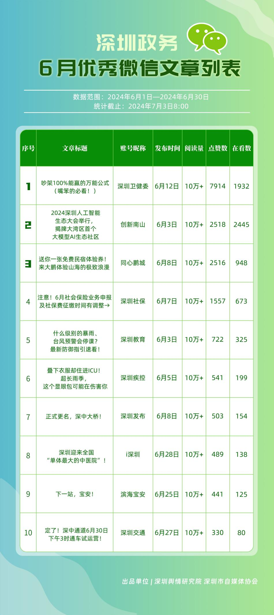 6月,“深圳衛(wèi)健委”“i深圳”“深圳龍崗發(fā)布”“幸福福田”“深圳交通”“深圳教育”“濱海寶安”“創(chuàng)新南山”“深圳工會”“青春深圳”“同心鵬城”“深圳光明”等30個政務(wù)微信公眾號,被評為“深圳優(yōu)秀政務(wù)微信公眾號”。6月,“深圳衛(wèi)健委”因內(nèi)容策劃出色、受眾互動活躍、作品火熱“出圈”等,榮登排行榜首位?!皠?chuàng)新南山”“同心鵬城”“深圳社保”“深圳教育”等上榜公眾號也積極創(chuàng)作優(yōu)質(zhì)作品,抓住時下熱點趨勢,集中發(fā)揮政務(wù)媒體傳播力量,推動了政務(wù)信息傳播工作提質(zhì)增效。