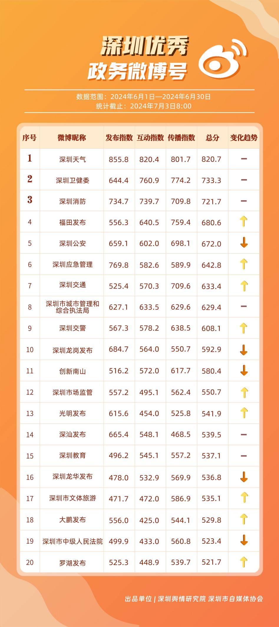 《深圳優(yōu)秀政務(wù)新媒體矩陣》將深圳黨政機關(guān)、企事業(yè)單位開設(shè)的政務(wù)公眾號(微信)、微博號、抖音號、視頻號(微信)及頭條號按照發(fā)布指數(shù)、互動指數(shù)、傳播指數(shù)三項指標(biāo)進行綜合評價,最終形成優(yōu)秀名單。
