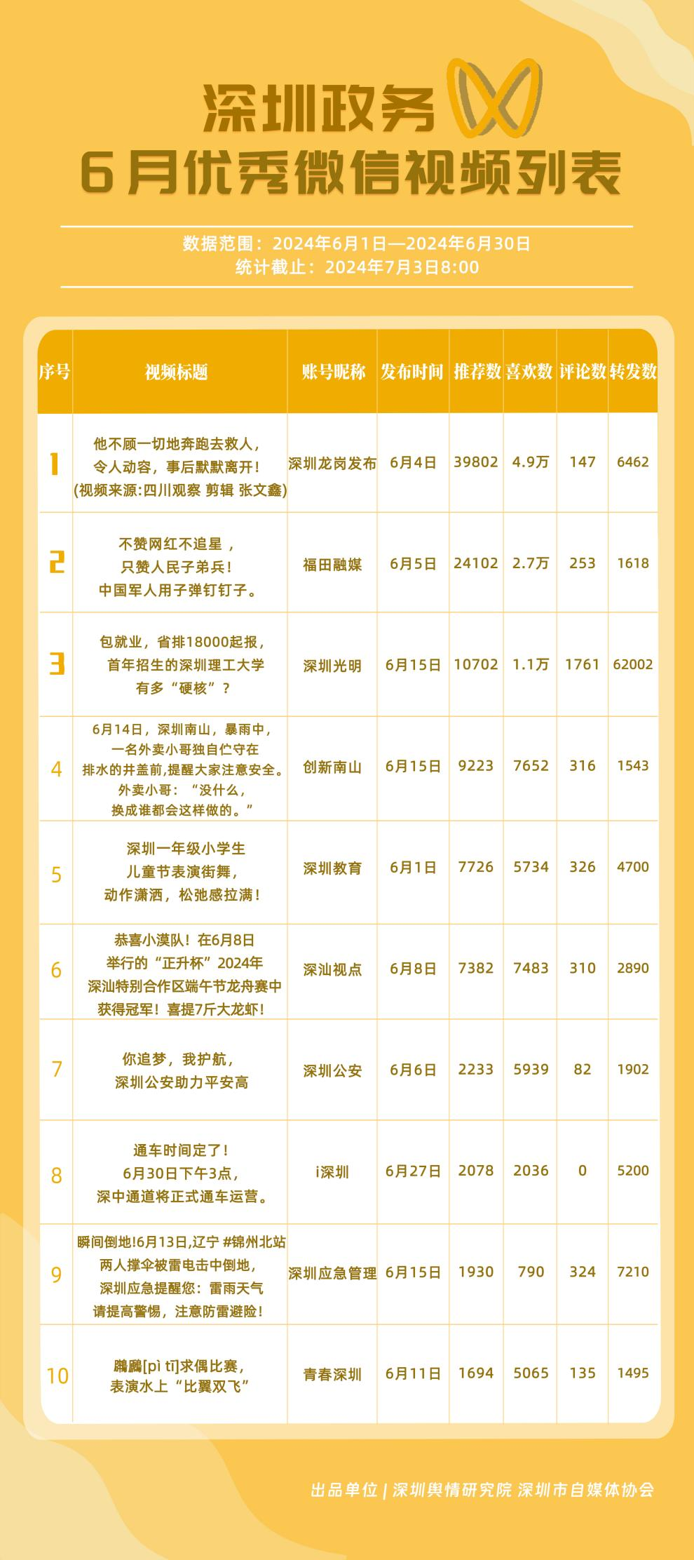 6月,政務(wù)微信視頻號“深圳光明”“福田融媒”“創(chuàng)新南山”“深圳教育”“深圳龍崗發(fā)布”“深汕觀點”“深圳工會”“深圳公安”“深圳應(yīng)急管理”和“青春深圳”榮獲“深圳優(yōu)秀政務(wù)微信視頻號”稱號。結(jié)合整體數(shù)據(jù)來看,6月深圳政務(wù)視頻號平臺推出多條爆款視頻,如《他不顧一切地奔跑去救人,令人動容,事后默默離開!》《不贊網(wǎng)紅不追星,只贊人民子弟兵!中國軍人用子彈釘釘子》等作品,收獲了上萬的推薦數(shù)和喜歡數(shù),是政務(wù)信息傳播高效化和正能量傳播機制的體現(xiàn)。