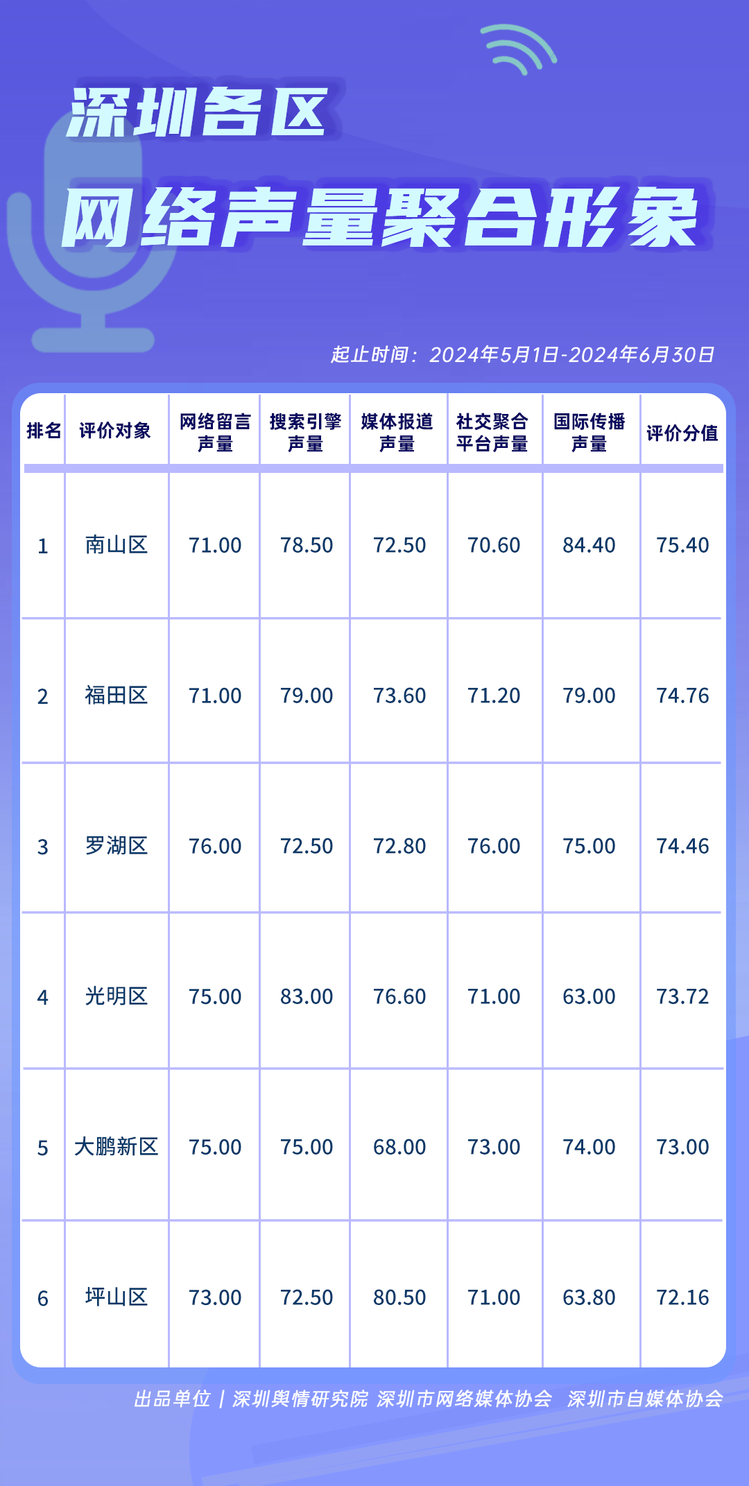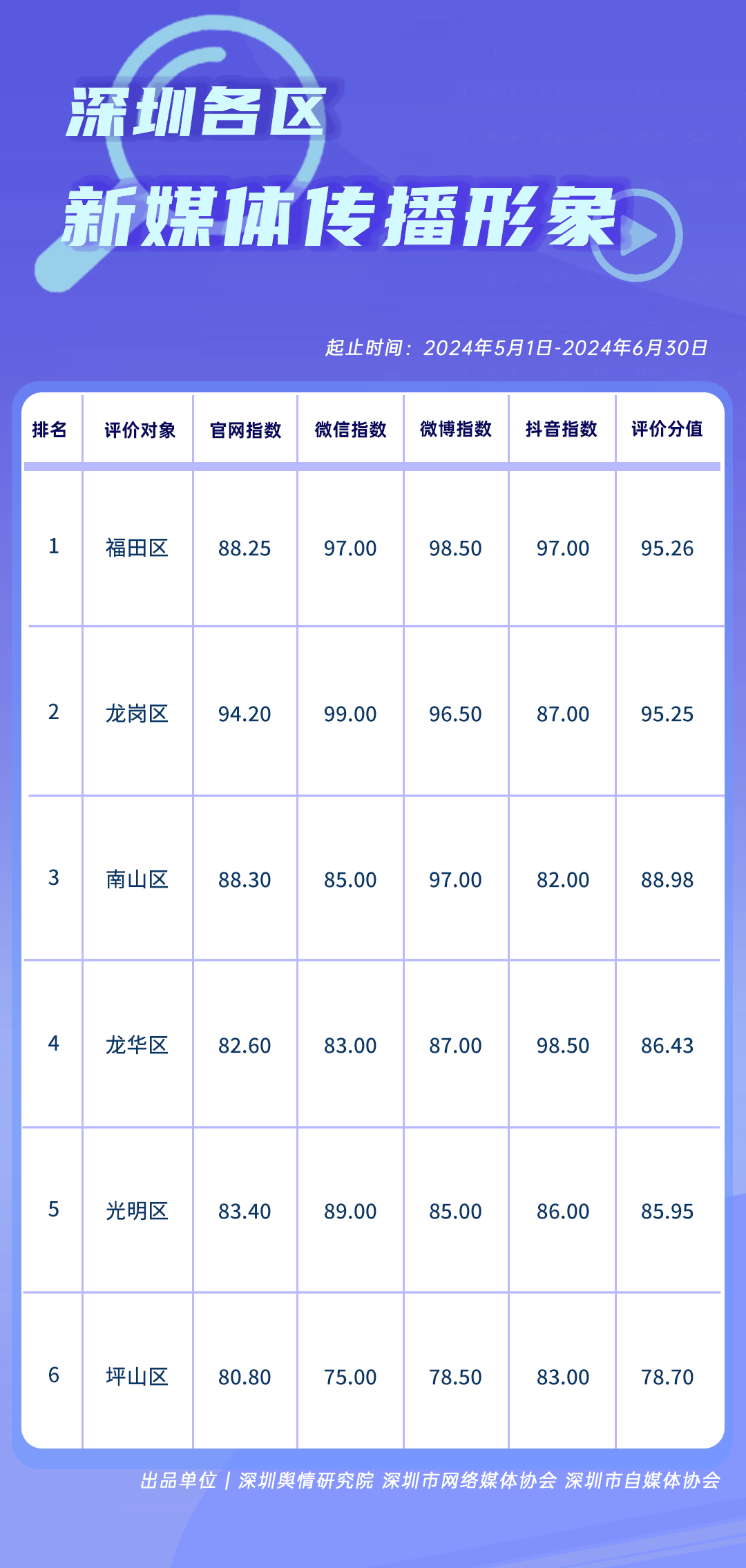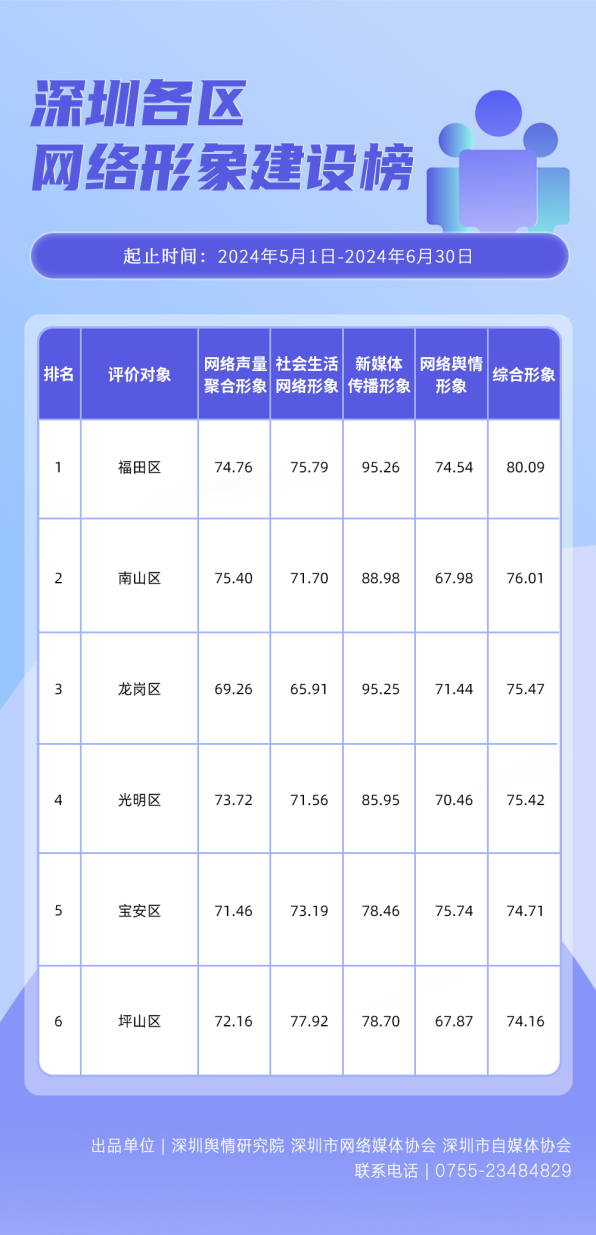 為全面評(píng)估深圳各區(qū)各單位網(wǎng)絡(luò)形象建設(shè)情況,助力各區(qū)各單位持續(xù)響應(yīng)居民對(duì)美好生活的期許,賦能城市高質(zhì)量發(fā)展,深圳輿情研究院、深圳市網(wǎng)絡(luò)媒體協(xié)會(huì)、深圳市自媒體協(xié)會(huì)聯(lián)合推出“深圳各區(qū)各單位網(wǎng)絡(luò)形象建設(shè)榜”,從網(wǎng)絡(luò)聚合聲量、留言互動(dòng)成效、社會(huì)生活評(píng)價(jià)、輿情管理能力及新媒體傳播水平等方面,多維度分析深圳各區(qū)(含大鵬新區(qū)、深汕特別合作區(qū))、各市直單位(市直屬單位、直屬部門)的網(wǎng)絡(luò)形象建設(shè)成果,凸顯各區(qū)各單位的“共性”與“個(gè)性”。