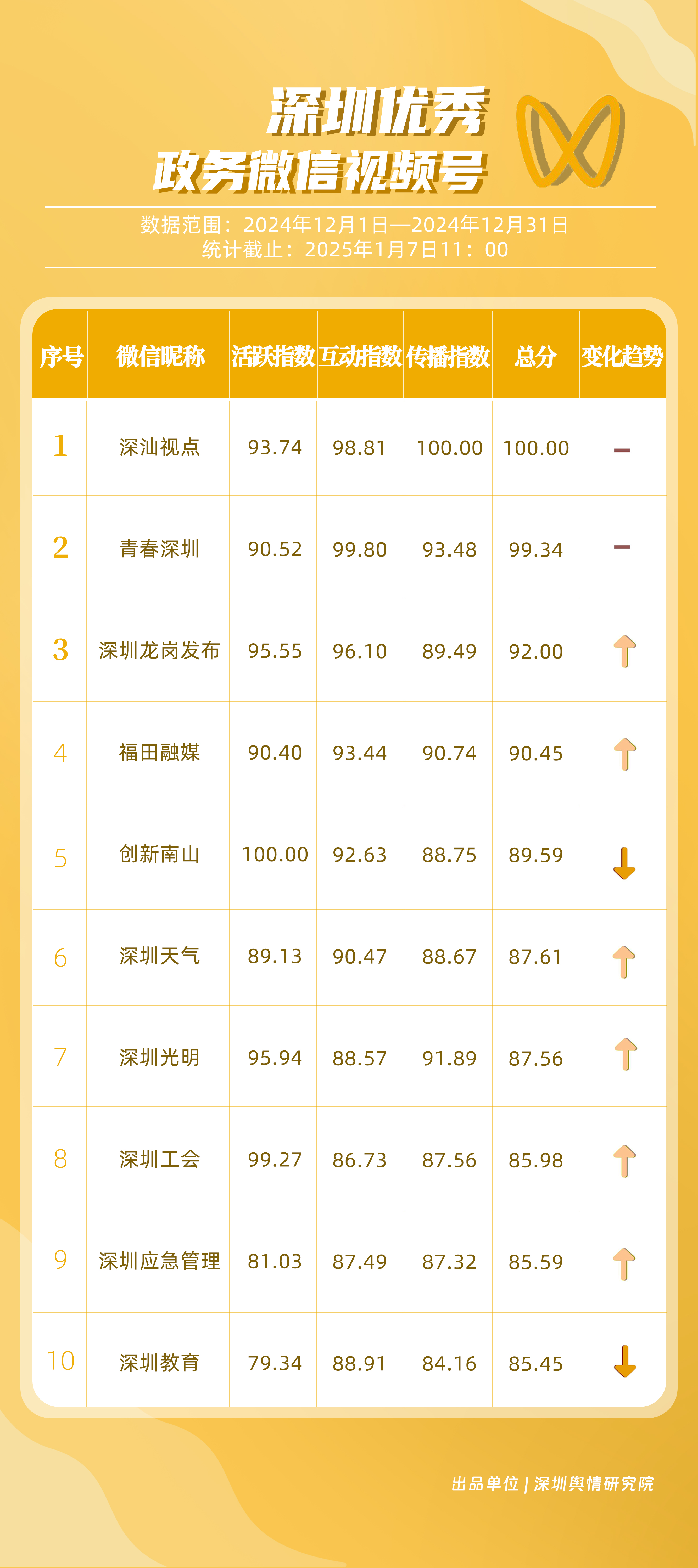 12月,獲“深圳優(yōu)秀政務(wù)微信視頻號”稱號的分別是“深汕視點”“青春深圳”“深圳龍崗發(fā)布”“福田融媒”“創(chuàng)新南山”“深圳天氣”“深圳光明”“深圳工會”“深圳應(yīng)急管理”“深圳教育”。其中,“深汕視點”“青春深圳”在互動方面表現(xiàn)突出,占據(jù)榜單第一、第二位置?!吧钲邶垗彴l(fā)布”活躍、互動指數(shù)位于各政務(wù)視頻號前列,排名有所提升。“福田融媒”三大指標(biāo)得分均在90分以上,位于榜單第四名,充分展現(xiàn)各政務(wù)微信視頻號在信息更新、用戶互動以及傳播范圍等方面的卓越能力和持續(xù)進步。