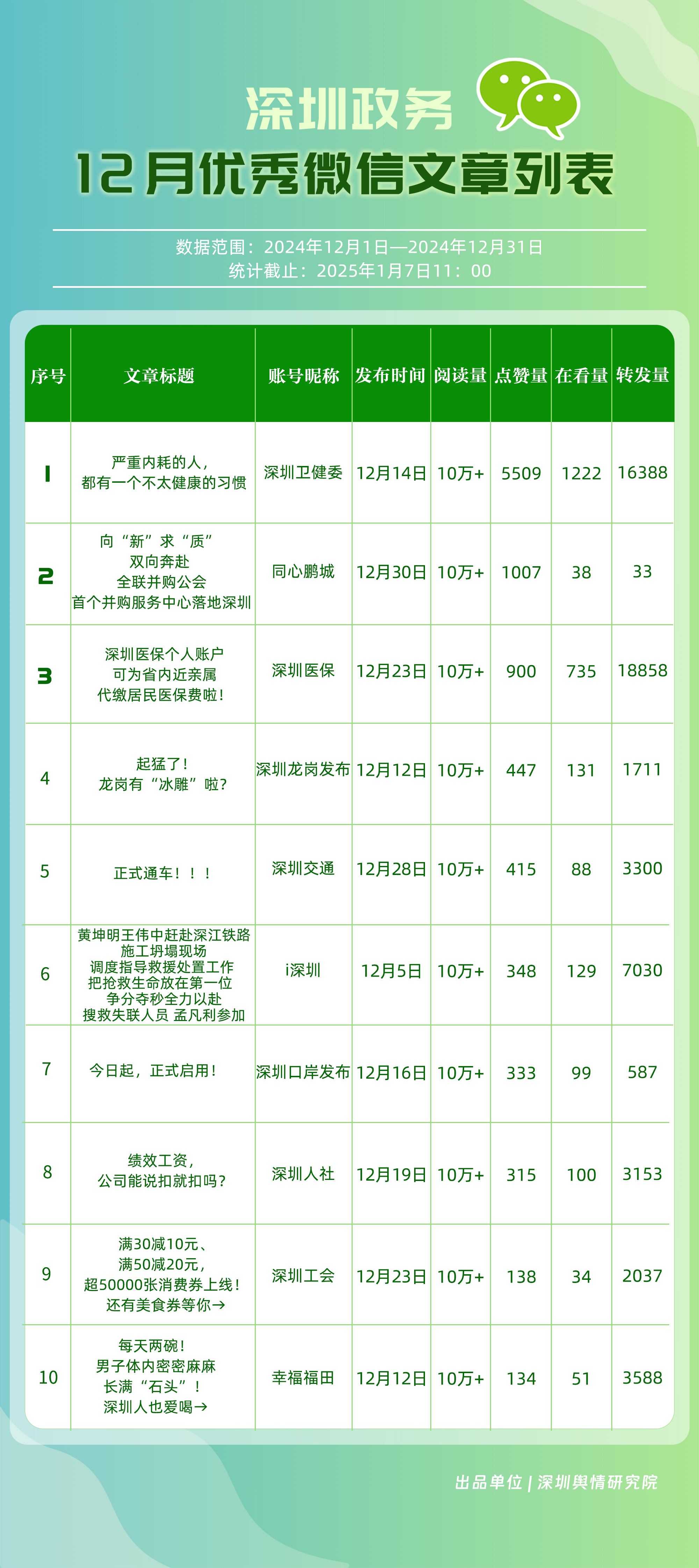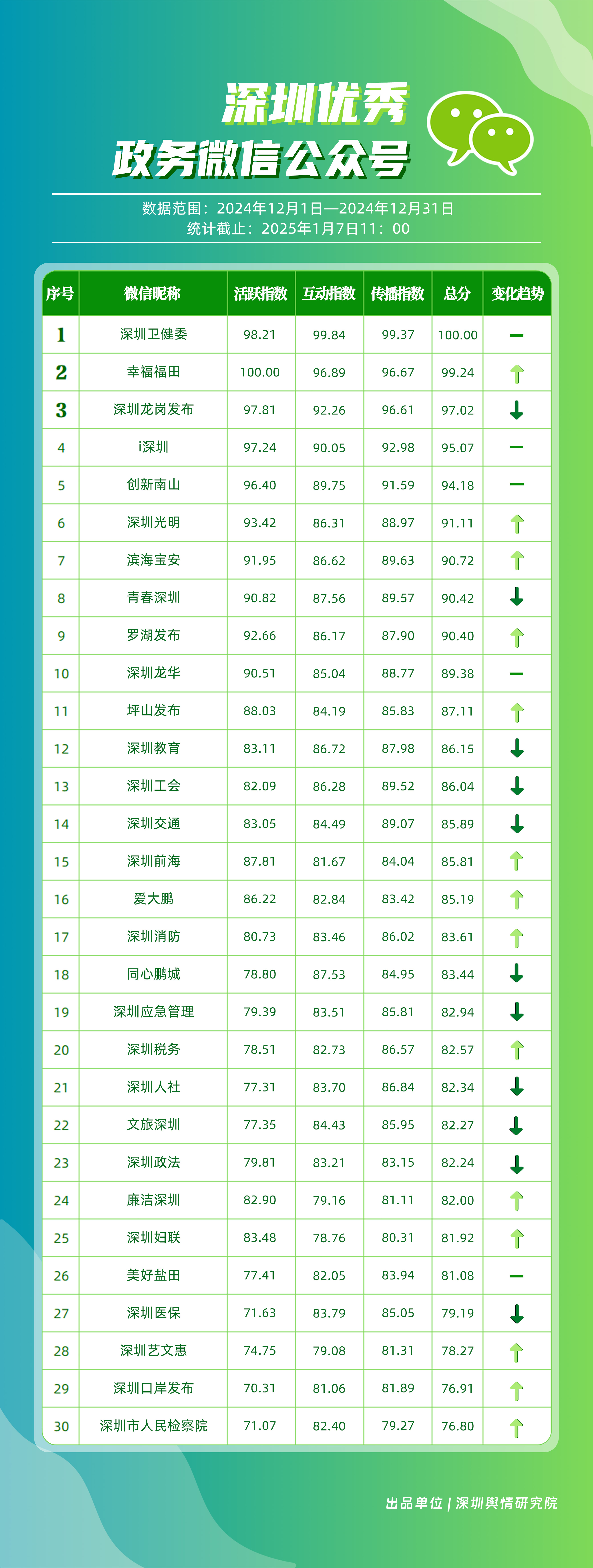 12月,“深圳衛(wèi)健委”“幸福福田”“深圳龍崗發(fā)布”“i深圳”“創(chuàng)新南山”“深圳光明”“濱海寶安”“青春深圳”“羅湖發(fā)布”“深圳龍華”等30個賬號入選“深圳優(yōu)秀政務(wù)微信公眾號”。其中,“深圳衛(wèi)健委”位于榜單首位,總分為100分?!靶腋8L铩薄吧钲诠饷鳌薄盀I海寶安”“羅湖發(fā)布”排名在本期有所提升,展現(xiàn)了他們不斷提升的傳播力、影響力?!癷深圳”“創(chuàng)新南山”則保持了穩(wěn)定的排名,持續(xù)在政務(wù)信息宣傳中發(fā)揮著重要作用。