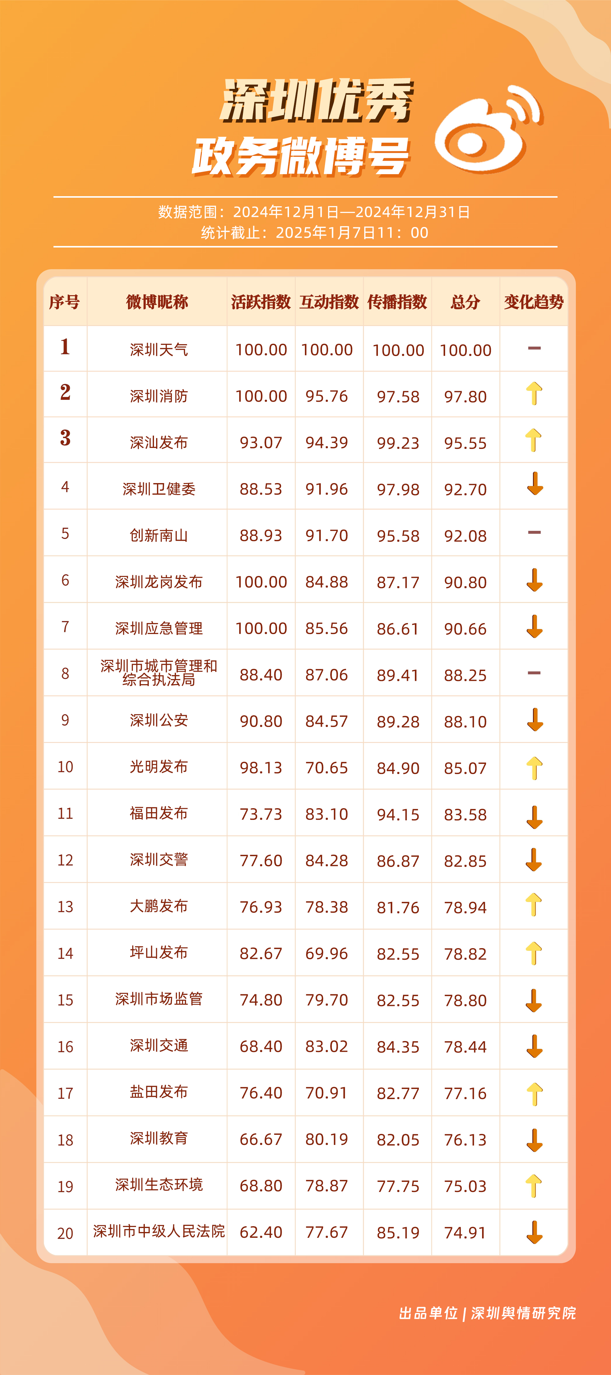 12月,“深圳天氣”“深圳消防”“深汕發(fā)布”“深圳衛(wèi)健委”“創(chuàng)新南山”“深圳龍崗發(fā)布”“深圳應(yīng)急管理”“深圳市城市管理和綜合執(zhí)法局”“深圳公安”“光明發(fā)布”等20個賬號入選“優(yōu)秀政務(wù)微博號”。“深圳天氣”獲得滿分,“深圳消防”“深汕發(fā)布”賬號總分均超95分,位于榜單前三名。同時,“深圳衛(wèi)健委”“創(chuàng)新南山”“深圳龍崗發(fā)布”及“深圳應(yīng)急管理”等賬號憑借對熱點的敏銳捕捉與信息的及時發(fā)布,總分在90分以上,體現(xiàn)出各自在提升公眾信息獲取質(zhì)量方面的不懈努力,彰顯了政務(wù)微博賬號在政民連接、信息共享等方面的巨大價值。