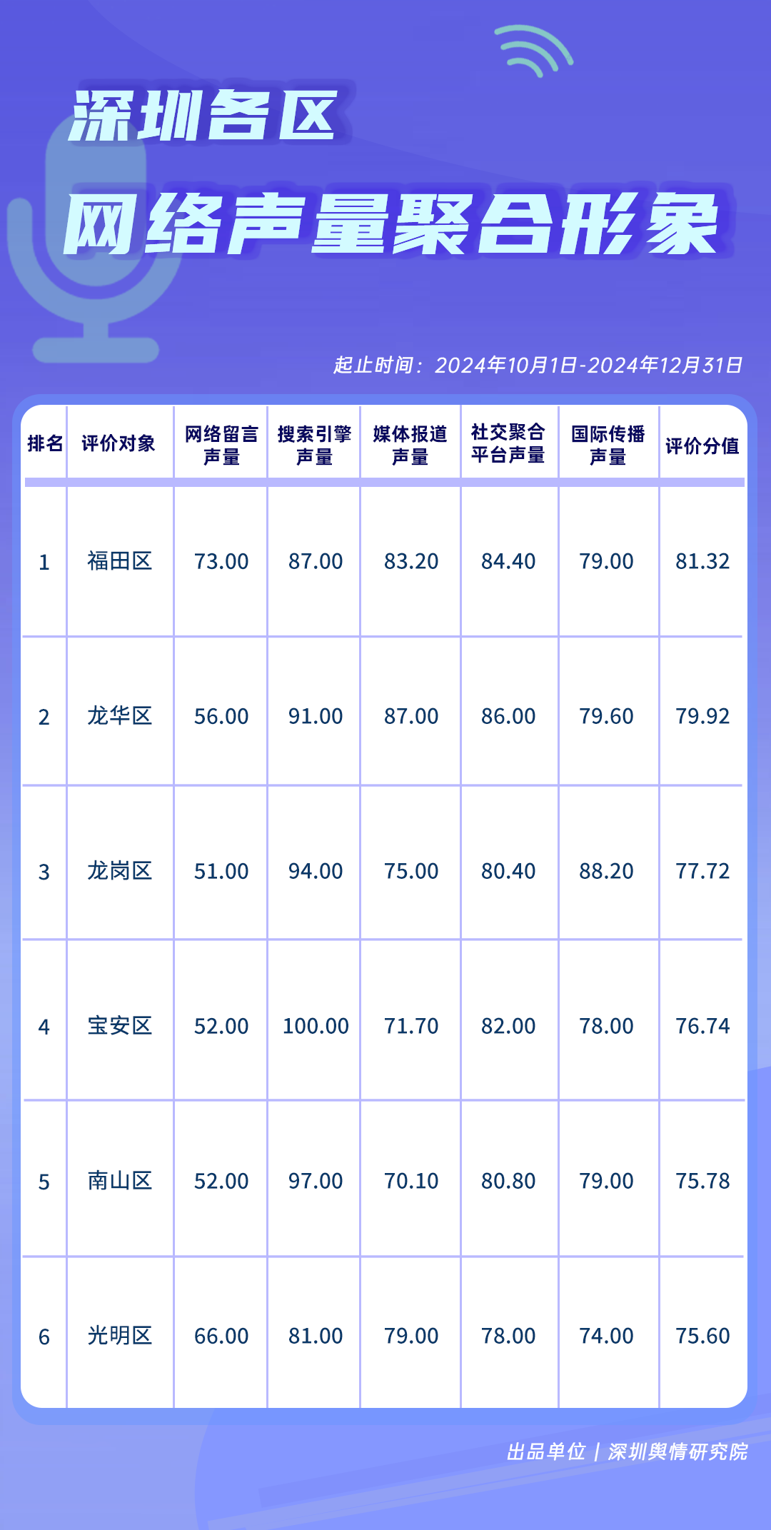 10-12月,福田區(qū)、龍崗區(qū)、光明區(qū)、龍華區(qū)、南山區(qū)、寶安區(qū)登上榜單前六。榜單中,福田區(qū)、龍崗區(qū)、光明區(qū)位列前三,綜合評價分值均在80分以上,居于榜單第四至第六名的龍華區(qū)、南山區(qū)、寶安區(qū)也在積極塑造網(wǎng)絡(luò)形象的道路上不斷邁進(jìn),展現(xiàn)了各區(qū)在網(wǎng)絡(luò)形象建設(shè)領(lǐng)域的蓬勃活力與持續(xù)努力。