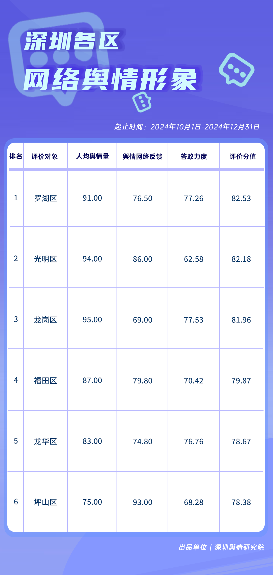 網(wǎng)絡(luò)輿情方面,羅湖區(qū)、光明區(qū)、龍崗區(qū)得分在80分以上,登上《深圳各區(qū)網(wǎng)絡(luò)輿情形象榜》前三名,福田區(qū)、龍華區(qū)、坪山區(qū)以超過75分的綜合評價分值上榜,體現(xiàn)出各區(qū)在維護(hù)良好網(wǎng)絡(luò)輿情生態(tài)、快速響應(yīng)網(wǎng)民關(guān)切等方面的積極態(tài)度。