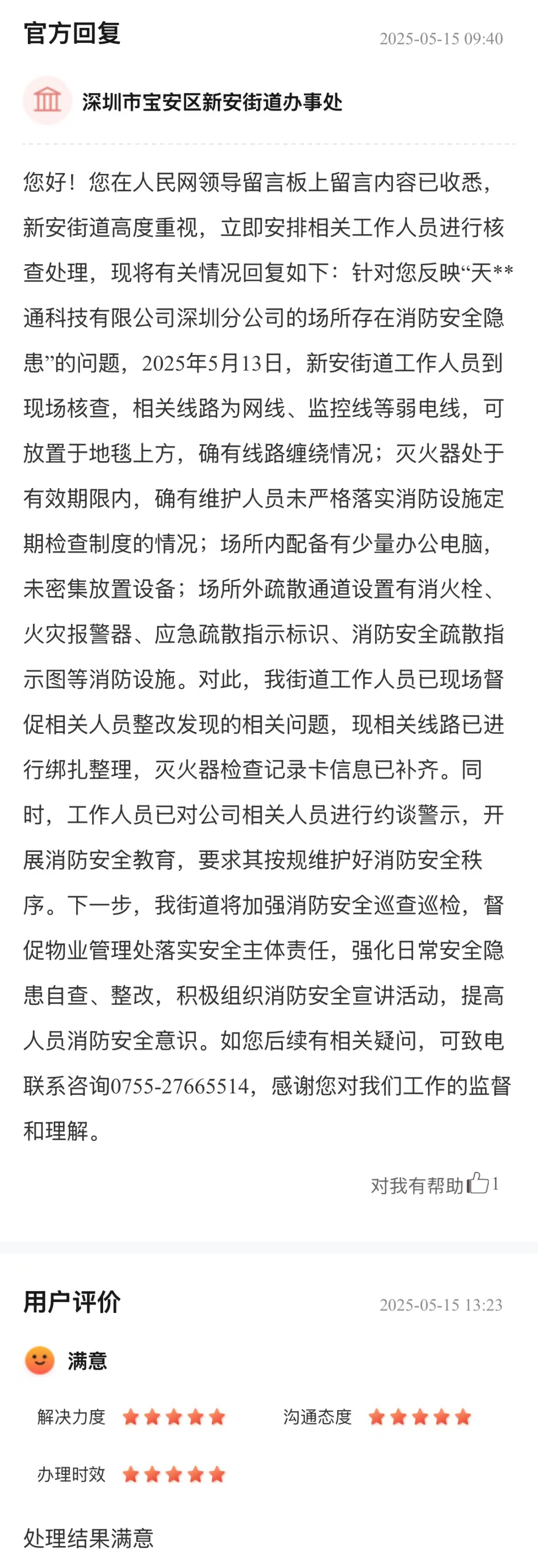企業(yè)電氣線路混亂、滅火器維護缺位等消防隱患,直接威脅員工生命財產(chǎn)安全,更潛藏重大事故風險。街道辦收到市民反饋后,迅速核查并高效解決現(xiàn)存問題,以“即知即改”的行動力回應群眾關切。后續(xù)通過約談警示、安全宣教等舉措,從“治已病”轉(zhuǎn)向“防未病”,切實筑牢區(qū)域消防安全屏障,展現(xiàn)基層對安全隱患的快速治理能力,傳遞出“民生安全無小事”的責任擔當,獲得網(wǎng)民的五星好評。