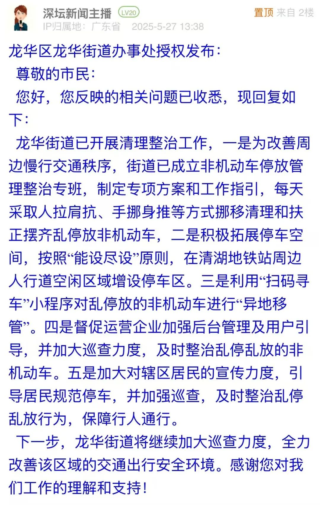 案例點評:地鐵口電動車與共享單車堆積,既阻礙行人通行,更影響區(qū)域交通秩序與城市形象。龍華街道辦接訴后迅速響應,成立專項整治專班,通過每日清理扶正、增設停車區(qū)、“掃碼尋車”移管、督促企業(yè)巡查及居民宣傳引導等多維度舉措,破解亂停難題,以“疏堵結合”的治理智慧,快速行動,綜合施策,為改善區(qū)域交通環(huán)境提供了務實范本。
