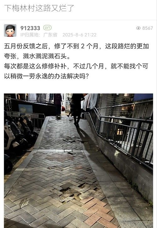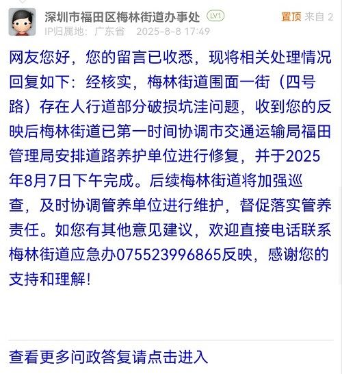 網(wǎng)友您好,您的留言已收悉,現(xiàn)將相關(guān)處理情況回復(fù)如下:經(jīng)核實(shí),梅林街道圍面一街(四號(hào)路)存在人行道部分破損坑洼問題,收到您的反映后梅林街道已第一時(shí)間協(xié)調(diào)市交通運(yùn)輸局福田管理局安排道路養(yǎng)護(hù)單位進(jìn)行修復(fù),并于2025年8月7日下午完成。后續(xù)梅林街道將加強(qiáng)巡查,及時(shí)協(xié)調(diào)管養(yǎng)單位進(jìn)行維護(hù),督促落實(shí)管養(yǎng)責(zé)任。如您有其他意見建議,歡迎直接電話聯(lián)系梅林街道應(yīng)急辦075523996865反映,感謝您的支持和理解!