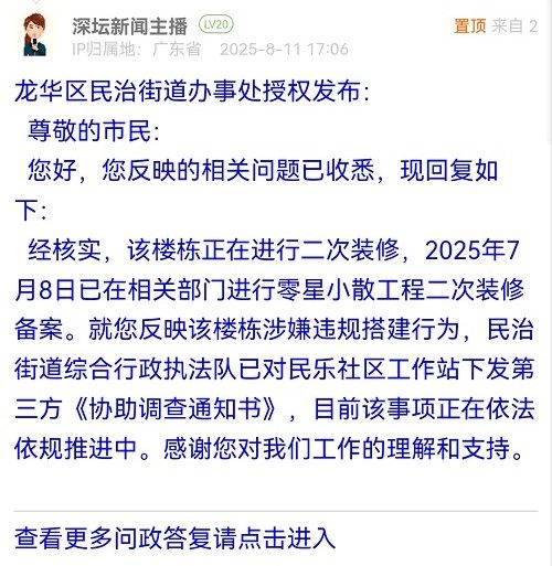 經(jīng)核實(shí),該樓棟正在進(jìn)行二次裝修,2025年7月8日已在相關(guān)部門進(jìn)行零星小散工程二次裝修備案。就您反映該樓棟涉嫌違規(guī)搭建行為,民治街道綜合行政執(zhí)法隊(duì)已對(duì)民樂社區(qū)工作站下發(fā)第三方《協(xié)助調(diào)查通知書》,目前該事項(xiàng)正在依法依規(guī)推進(jìn)中。感謝您對(duì)我們工作的理解和支持。