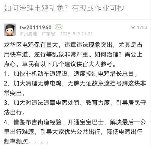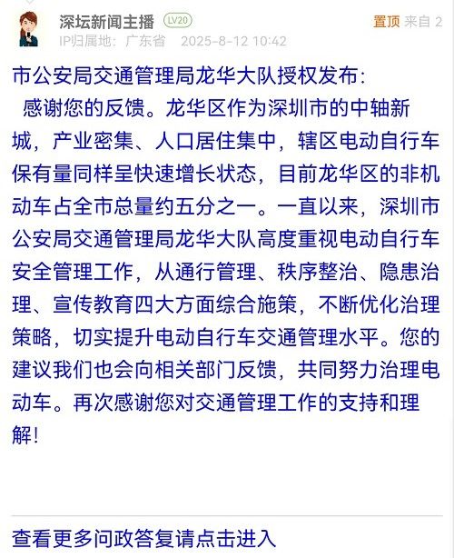 感謝您的反饋。龍華區(qū)作為深圳市的中軸新城,產(chǎn)業(yè)密集、人口居住集中,轄區(qū)電動(dòng)自行車保有量同樣呈快速增長(zhǎng)狀態(tài),目前龍華區(qū)的非機(jī)動(dòng)車占全市總量約五分之一。一直以來,深圳市公安局交通管理局龍華大隊(duì)高度重視電動(dòng)自行車安全管理工作,從通行管理、秩序整治、隱患治理、宣傳教育四大方面綜合施策,不斷優(yōu)化治理策略,切實(shí)提升電動(dòng)自行車交通管理水平。您的建議我們也會(huì)向相關(guān)部門反饋,共同努力治理電動(dòng)車。再次感謝您對(duì)交通管理工作的支持和理解!