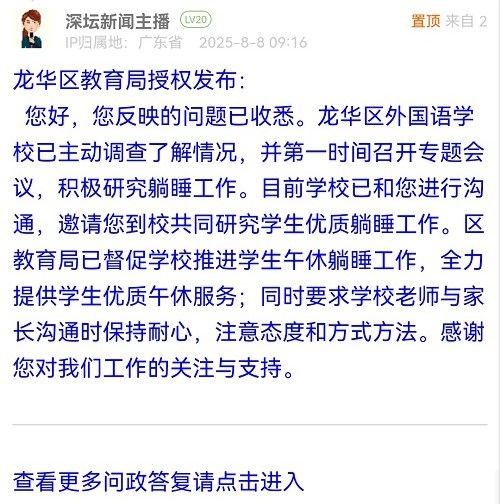 您好,您反映的問題已收悉。龍華區(qū)外國(guó)語學(xué)校已主動(dòng)調(diào)查了解情況,并第一時(shí)間召開專題會(huì)議,積極研究躺睡工作。目前學(xué)校已和您進(jìn)行溝通,邀請(qǐng)您到校共同研究學(xué)生優(yōu)質(zhì)躺睡工作。區(qū)教育局已督促學(xué)校推進(jìn)學(xué)生午休躺睡工作,全力提供學(xué)生優(yōu)質(zhì)午休服務(wù);同時(shí)要求學(xué)校老師與家長(zhǎng)溝通時(shí)保持耐心,注意態(tài)度和方式方法。感謝您對(duì)我們工作的關(guān)注與支持。