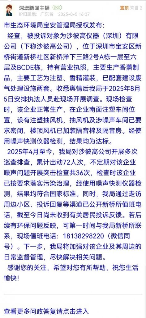 經(jīng)查,被投訴對(duì)象為沙彼高儀器(深圳)有限公司(下稱沙彼高公司),位于深圳市寶安區(qū)新橋街道新橋社區(qū)新橋洋下三路2號(hào)A棟一層至六層及BCDE棟,持有營(yíng)業(yè)執(zhí)照,主要生產(chǎn)香薰制品,主要工藝為注塑、香精灌裝,已配套建設(shè)廢氣處理設(shè)施兩套。收悉輿情后我局于2025年8月5日安排執(zhí)法人員赴現(xiàn)場(chǎng)開展調(diào)查。現(xiàn)場(chǎng)檢查時(shí),該企業(yè)正常生產(chǎn),在企業(yè)南面注塑車間位置,設(shè)有注塑抽風(fēng)機(jī),抽風(fēng)機(jī)及涉噪聲車間已要求密閉,樓頂風(fēng)機(jī)已加裝隔音棉及隔音房。經(jīng)使用噪聲快測(cè)儀器檢測(cè),結(jié)果均為達(dá)標(biāo)。
