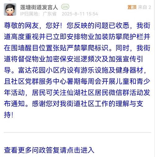 尊敬的網(wǎng)友,您好!您反映的問題已收悉,我街道高度重視并已立即安排物業(yè)加裝防攀爬護(hù)欄并在圍墻醒目位置張貼嚴(yán)禁攀爬標(biāo)識(shí)。同時(shí),我街道將督促物業(yè)加密保安巡邏頻次及加強(qiáng)宣傳引導(dǎo)。富達(dá)花園小區(qū)內(nèi)設(shè)有游樂設(shè)施及健身器材,且社區(qū)黨群服務(wù)中心暑期每周會(huì)開展兒童和青少年活動(dòng),居民可關(guān)注仙湖社區(qū)居民微信群活動(dòng)發(fā)布通知。感謝您對(duì)我街道社區(qū)工作的理解與支持!