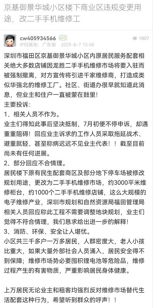 18. 帖文《京基御景華城小區(qū)樓下商業(yè)區(qū)違規(guī)變更用途,改二手手機(jī)維修工》
