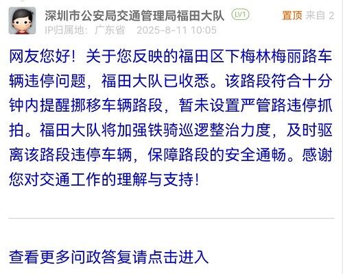 網(wǎng)友您好!關(guān)于您反映的福田區(qū)下梅林梅麗路車輛違停問題,福田大隊(duì)已收悉。該路段符合十分鐘內(nèi)提醒挪移車輛路段,暫未設(shè)置嚴(yán)管路違停抓拍。福田大隊(duì)將加強(qiáng)鐵騎巡邏整治力度,及時(shí)驅(qū)離該路段違停車輛,保障路段的安全通暢。感謝您對(duì)交通工作的理解與支持!