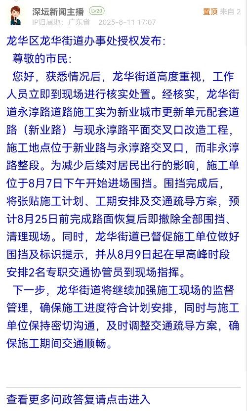 您好,獲悉情況后,龍華街道高度重視,工作人員立即到現(xiàn)場(chǎng)進(jìn)行核實(shí)處置。經(jīng)核實(shí),龍華街道永淳路道路施工實(shí)為新業(yè)城市更新單元配套道路(新業(yè)路)與現(xiàn)永淳路平面交叉口改造工程,施工地點(diǎn)位于新業(yè)路與永淳路交叉口,而非永淳路整段。為減少后續(xù)對(duì)居民出行的影響,施工單位于8月7日下午開始進(jìn)場(chǎng)圍擋。圍擋完成后,將張貼施工計(jì)劃、工期安排及交通疏導(dǎo)方案,預(yù)計(jì)8月25日前完成路面恢復(fù)后即撤除全部圍擋、清理現(xiàn)場(chǎng)。同時(shí),龍華街道已督促施工單位做好圍擋及標(biāo)識(shí)提示,并從8月9日起在早高峰時(shí)段安排2名專職交通協(xié)管員到現(xiàn)場(chǎng)指揮。