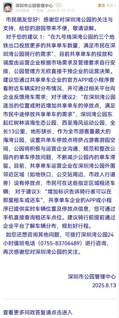 對(duì)于您的建議 1:“在九號(hào)線深灣公園的三個(gè)地鐵出口投放更多的共享單車數(shù)量,滿足市民在深圳灣公園騎行的需求”,目前共享單車的投放和調(diào)度由運(yùn)營(yíng)企業(yè)根據(jù)市場(chǎng)需求及管理要求自行安排,公園管理方無權(quán)直接干預(yù)企業(yè)的運(yùn)營(yíng)決策。建議您通過共享單車企業(yè)的官方APP或小程序查看附近車輛實(shí)時(shí)分布情況,并可通過相關(guān)平臺(tái)向企業(yè)反饋用車需求;對(duì)于建議2:“在深圳灣公園適當(dāng)?shù)奈恢没蚋浇黾庸蚕韱诬嚨耐7劈c(diǎn),滿足市民中途停放共享單車的需求”,深圳灣公園東起紅樹林濱海生態(tài)公園,西至海風(fēng)運(yùn)動(dòng)公園,全長(zhǎng)13公里,地形狹長(zhǎng),作為全市游客量最大的海灣公園,設(shè)置共單車停放點(diǎn)將擠占游客游園空間,公園將積極與運(yùn)營(yíng)企業(yè)溝通,規(guī)范和整改公園內(nèi)的單車停放問題,不斷減少公園內(nèi)的單車滯留。目前,共享單車運(yùn)營(yíng)企業(yè)在深圳灣公園外圍鄰近區(qū)域(如地鐵口、公交站周邊、市政人行道旁)設(shè)有停放點(diǎn),市民可在這些指定區(qū)域租還車輛; 對(duì)于建議3:“增加標(biāo)識(shí)告訴騎行者可以在那里租車或還車”,共享單車企業(yè)的APP或小程序已提供實(shí)時(shí)車輛位置及停放點(diǎn)信息,您可通過手機(jī)直接查詢租還車點(diǎn)位。建議騎行前提前通過企業(yè)平臺(tái)了解車輛分布,規(guī)劃好行程。