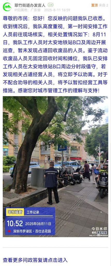 尊敬的市民:您好!您反映的問題我隊(duì)已收悉。收到情況后,我隊(duì)高度重視,第一時(shí)間安排工作人員前往現(xiàn)場(chǎng)核實(shí),相關(guān)處置情況如下:8月11日,我隊(duì)工作人員對(duì)太安地鐵站B口及周邊開展巡查,暫未發(fā)現(xiàn)占道回收廢品的人員。鑒于流動(dòng)收廢品人員無固定回收時(shí)間和攤位,我隊(duì)已安排工作人員在太安地鐵站B口周邊分時(shí)段值守,若發(fā)現(xiàn)相關(guān)占道經(jīng)營(yíng)人員,將立即予以勸離。對(duì)于不配合勸導(dǎo)的相關(guān)人員,將予以暫扣經(jīng)營(yíng)工具等措施。感謝您對(duì)城市管理工作的理解與支持!