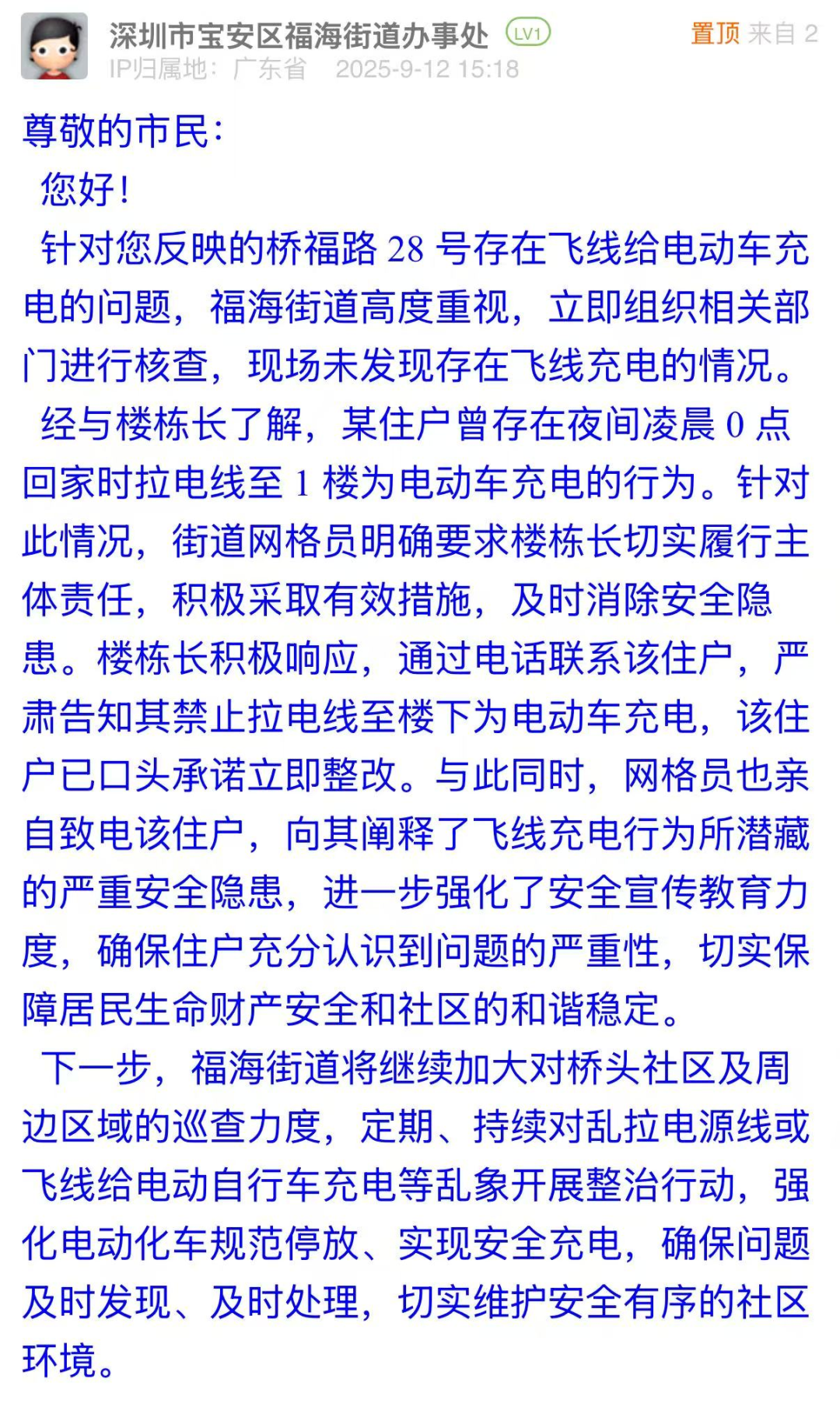 案例點評:福海街道辦對電動車“飛線充電”問題展現(xiàn)出快速響應(yīng)、權(quán)責(zé)明晰的治理態(tài)度,第一時間組織核查,既明確主體責(zé)任、嚴(yán)令整改,又細(xì)致開展安全教育,讓住戶充分認(rèn)知“飛線充電”的嚴(yán)重危害,體現(xiàn)執(zhí)法和普法的雙重?fù)?dān)當(dāng)?;貞?yīng)中,街道辦還表示將強化巡查力度、開展整治行動,建立長效治理機制,維護社區(qū)安全秩序,彰顯了基層治理中“問題導(dǎo)向、標(biāo)本兼治”的治理邏輯。