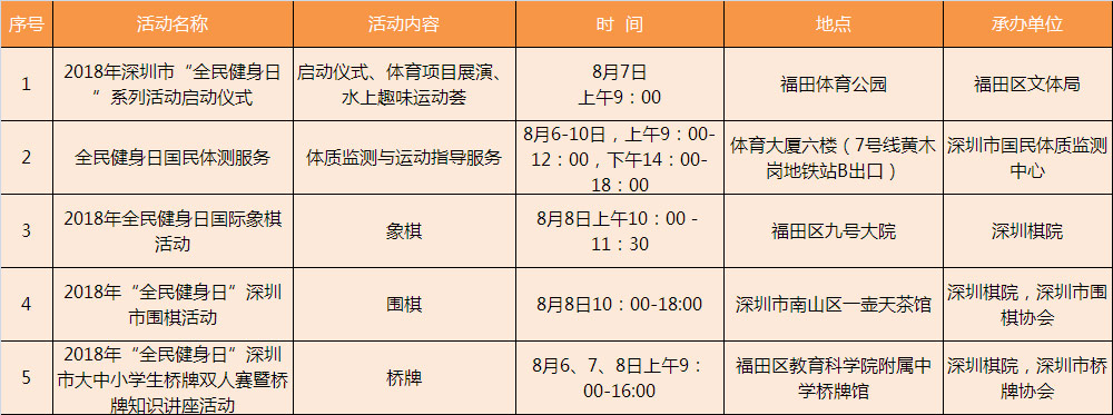 為迎接今年8月8日第十個全國“全民健身日”,增強全民健身意識,培養(yǎng)良好的體育鍛煉習(xí)慣,在全社會形成崇尚健身、參與健身、支持和推動全民健身事業(yè)發(fā)展的良好環(huán)境和氛圍,為構(gòu)建和諧社會發(fā)揮積極的作用,深圳市體育中心積極開展全民健身日免費開放系列活動,于8月8日免費開放(深圳體育館、深圳游泳跳水館、深圳網(wǎng)球中心、深圳體育場等四家體育場館,田徑、籃球、廣場體育、游泳、保齡球、壁球和網(wǎng)球7個項目。